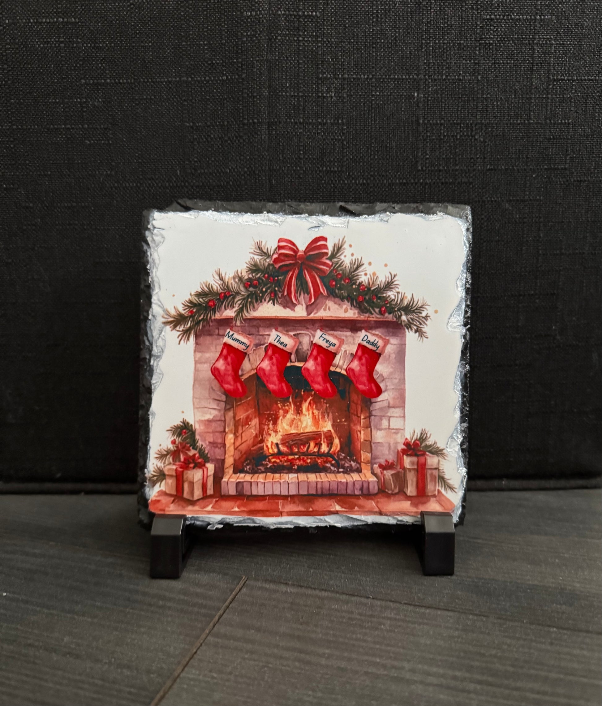 This slate tile decorated with the fireplace stocking is the perfect Christmas Decoration addition this festive season from 2-6 stockings add the family names for a slate tile that can be used year after year.